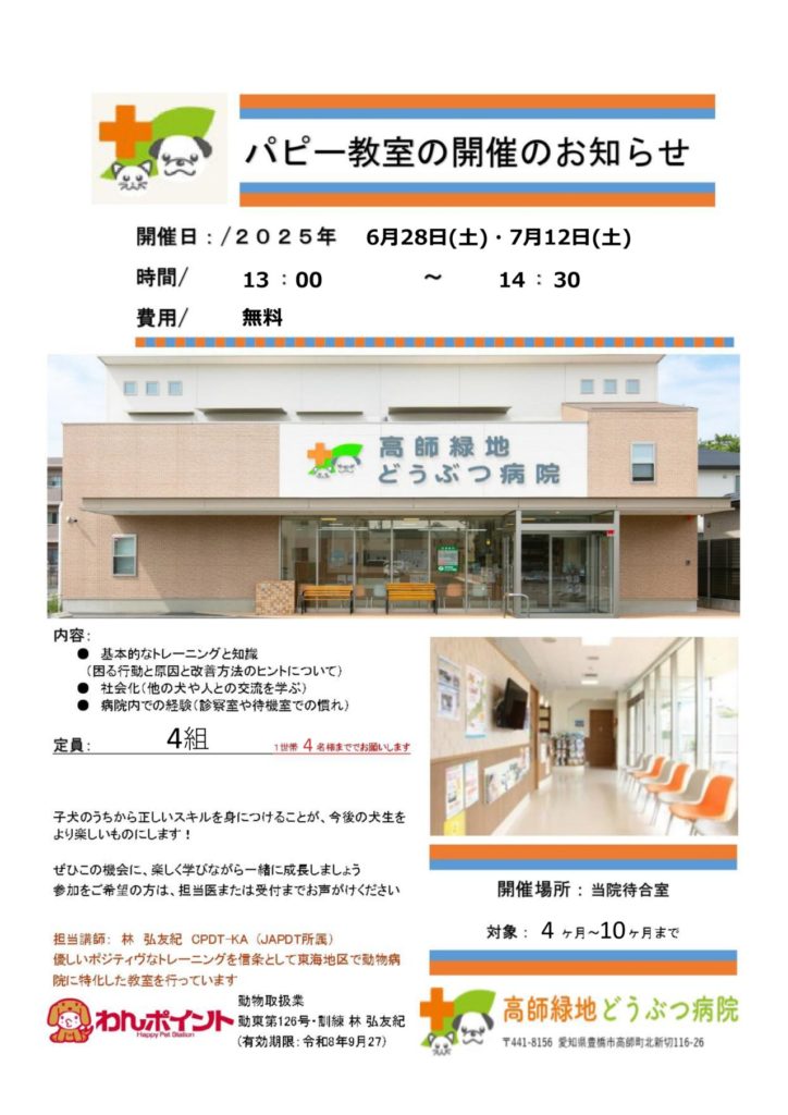 6月28日(土)・7月12日(土)13時より、生後4か月~10か月のワンちゃんを対象にパピー教室を開催します。