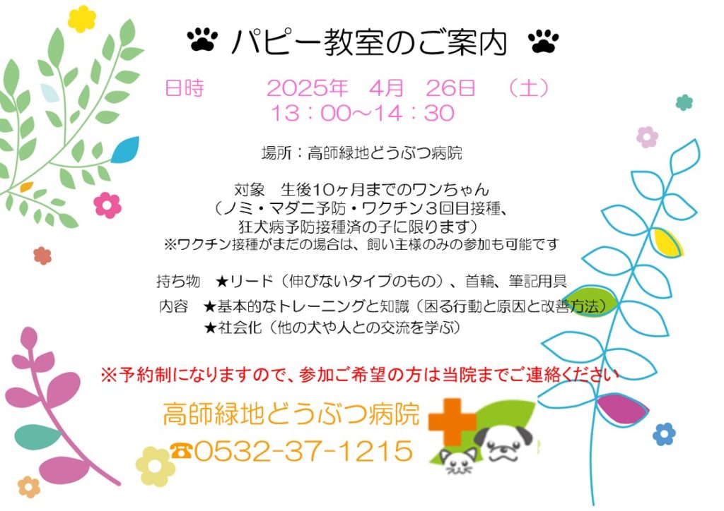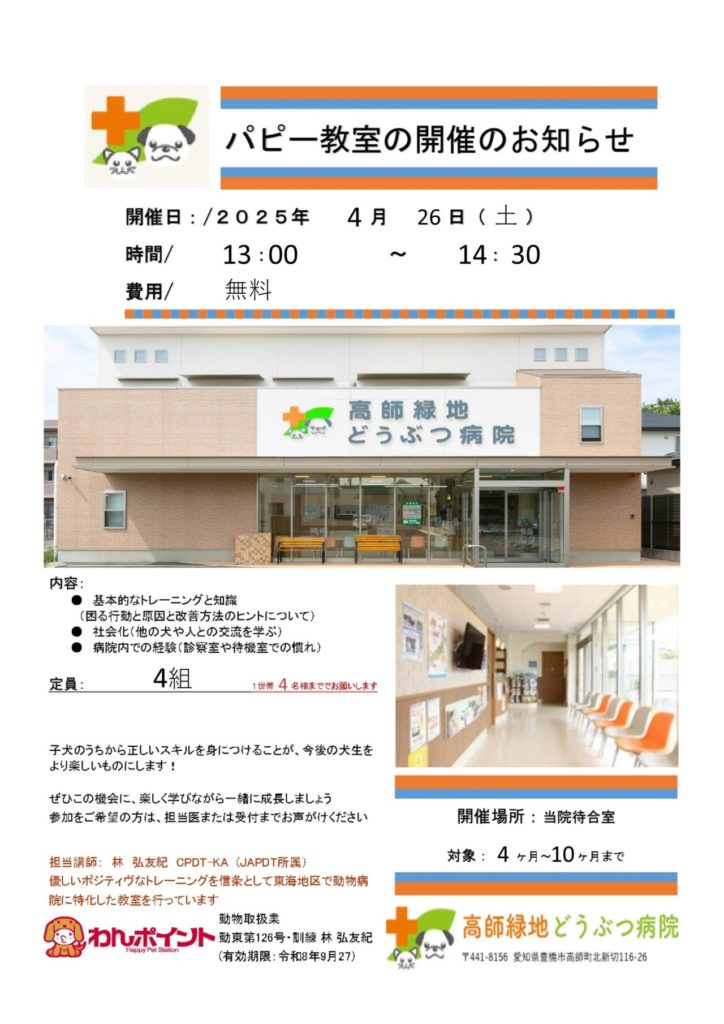 4月26日(土)13時より、生後4か月~10か月のワンちゃんを対象にパピー教室を開催します。